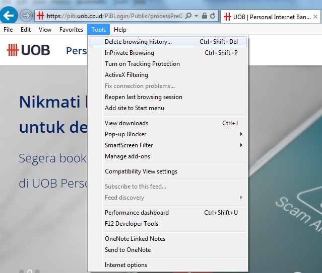 - Atau klik Tools lalu klik Delete Browsing History